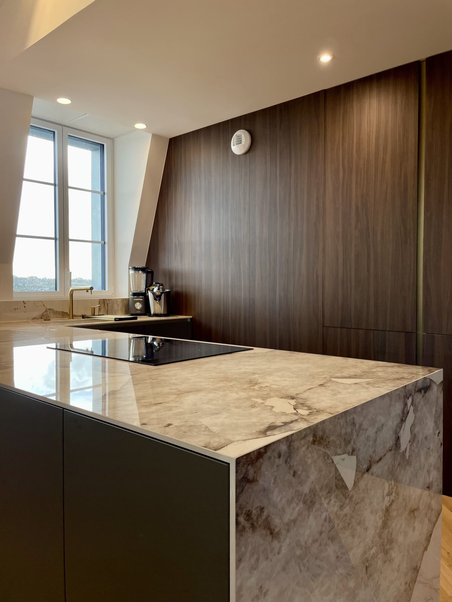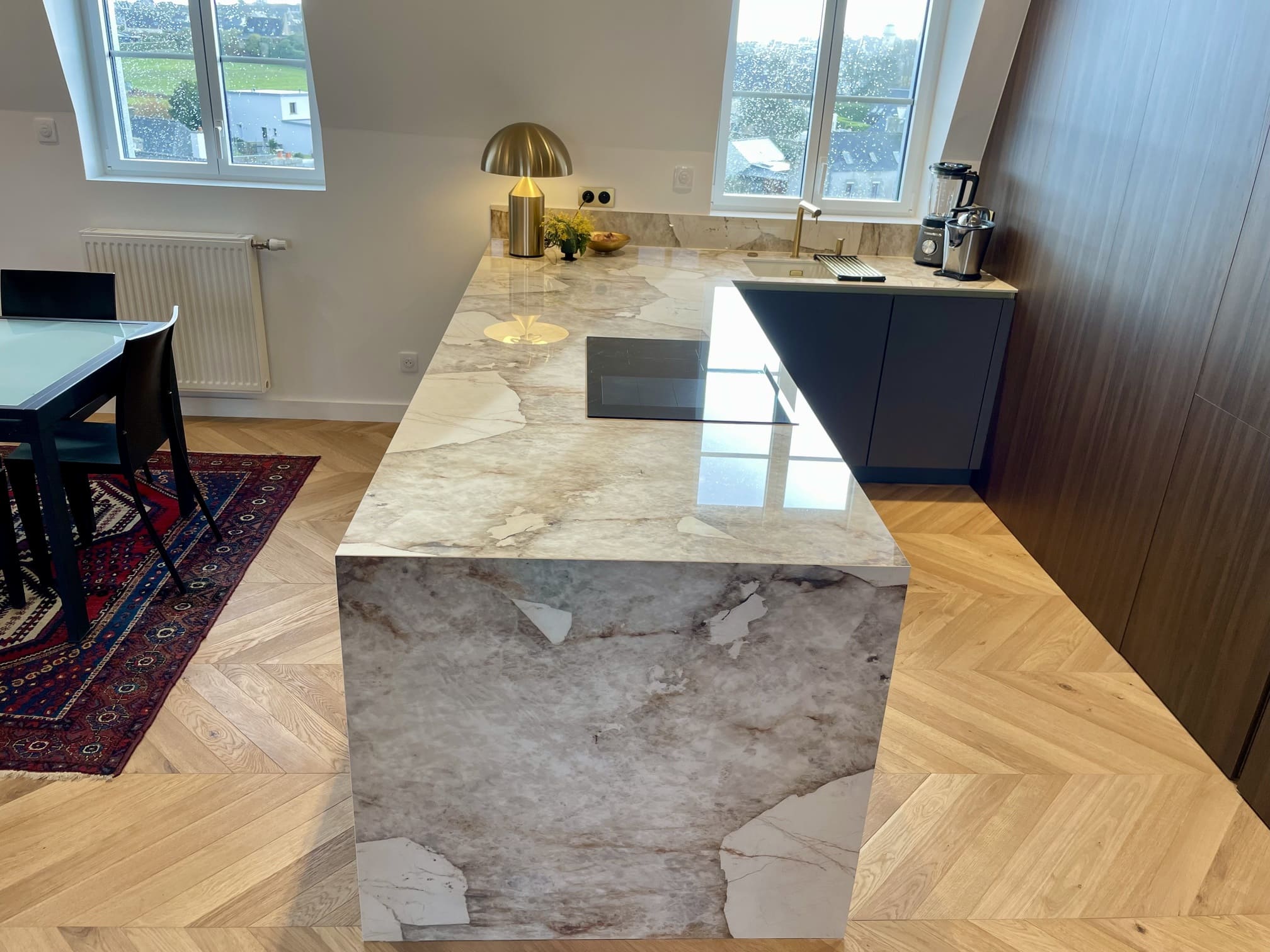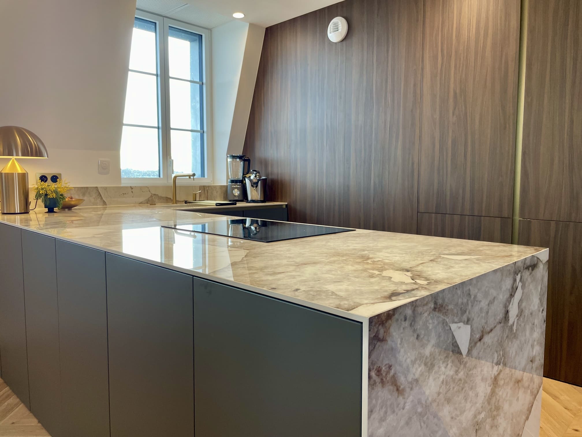 Réalisation d’une cuisine sur mesure mettant en valeur la finesse et l’élégance de la pierre USHUAIA en finition polie, épaisseur 12 mm. Ce matériau se distingue par son aspect profond et lumineux, sublimé par une brillance éclatante qui révèle toute la richesse de ses nuances et de ses veinages naturels. Le choix d’une épaisseur de 12 mm apporte une ligne contemporaine et épurée, tout en conservant la solidité et la durabilité indispensables à un plan de travail de cuisine. L’excellence de ce projet repose sur un travail de calepinage rigoureux réalisé en amont avec nos équipes. Cette étape essentielle a permis d'étudier la continuité des veines et l'agencement des coupes pour garantir un rendu visuel parfait, en totale harmonie avec les éléments environnants.