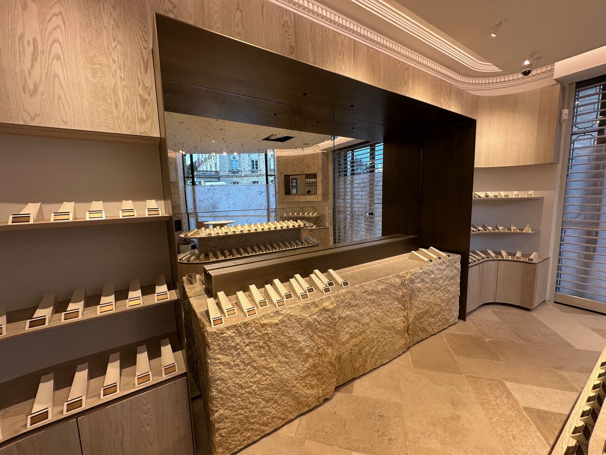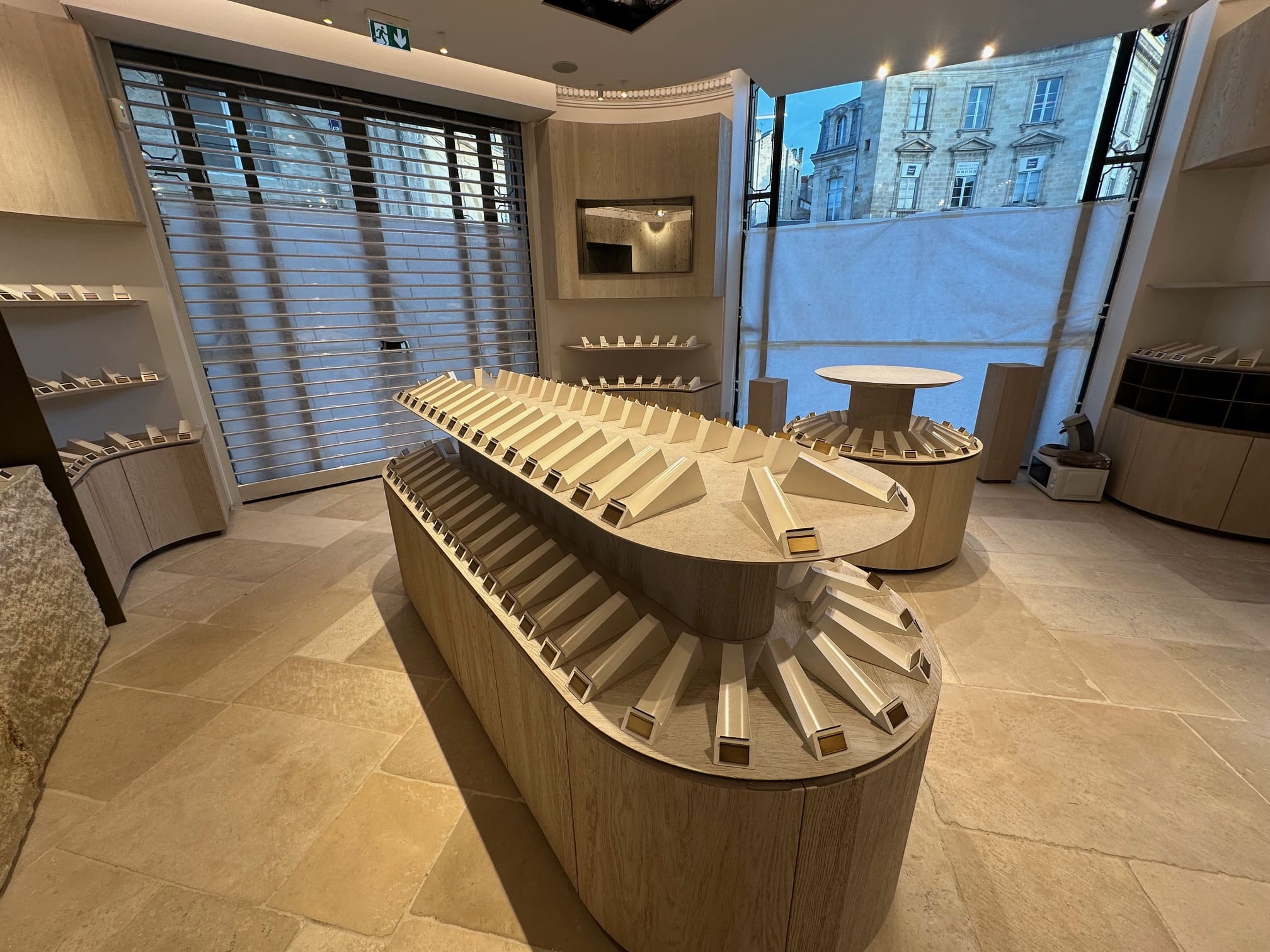 Réalisation sur mesure pour une boutique de champagne à Bordeaux, où la pierre naturelle devient un élément central de l’aménagement et de l’identité du lieu. L’espace est structuré autour d’un habillage en pierre de Frontenac massif, travaillé dans un esprit brut et authentique, apportant du caractère et une forte présence visuelle. Cet ensemble est associé à un plateau en Sinaï Pearl, choisi pour sa teinte claire et élégante, créant un contraste subtil avec la texture de la pierre. Le chant “aile d’avion” souligne la finesse des lignes et la précision du façonnage, tout en apportant une touche contemporaine à l’ensemble. Cette réalisation met en valeur l’équilibre entre matière, volumes et finitions, au service d’un espace à la fois fonctionnel et raffiné.